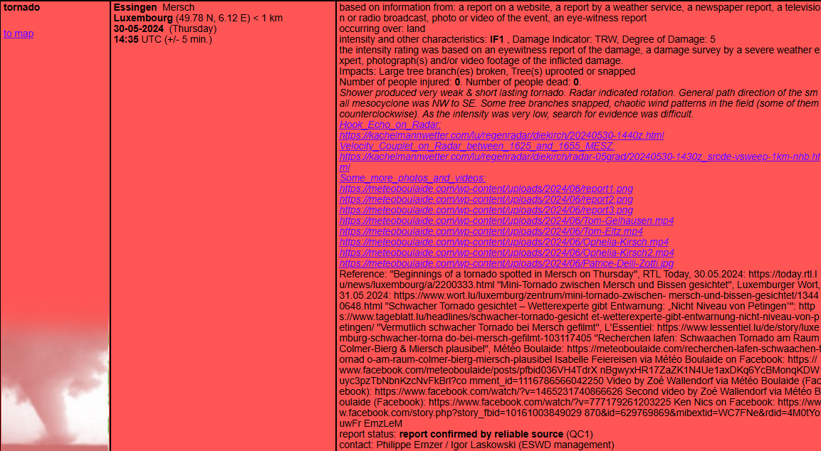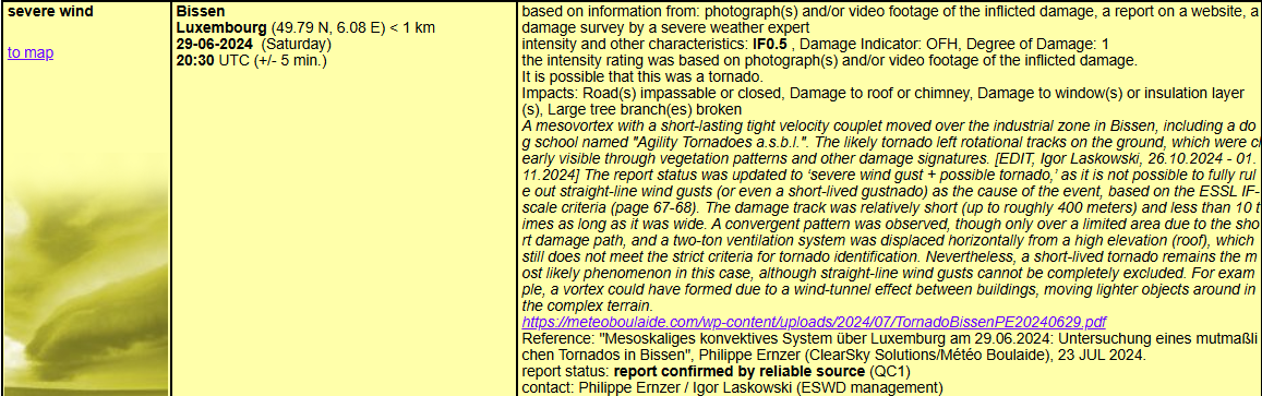 Duerch déi selwecht Problematik gouf deemools den Tornado vum 30. Mee 2024 zu Eessen als “keen Tornado” agestuuft, obwuel no eiser eegener Analys de Géigendeel konnt bewise ginn. Dat selwecht gëllt fir de Fall vum 29. Juni 2024: No däitleche Rotatiounsspuren op der Plaz gouf behaapt, et wier trotzdeem kee gewiescht. D’Experte vun der ESWD (European Severe Weather Database” hunn eis dunn awer wäitestgoend Recht ginn a soen haut, dass de warscheinlechste Phänomeen en Tornado gewiescht ass.